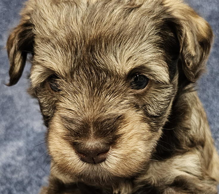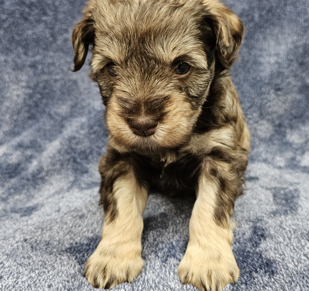 Evie is the biggest of the litter. She has a stunning liver/pepper coat and light tan legs. Evie’s eyes are a beautiful blue. Her greatest desire is to be in your arms and licking your face.